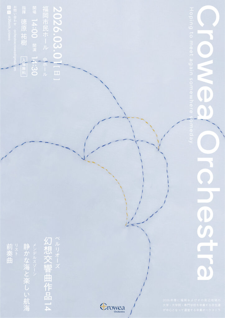 公演概要:オーケストラで出会い繋がった26年春卒業予定の福岡およびその周辺の大学生、大学院生が「卒業前に再集結し、演奏会をしたい」という思いから始まったオーケストラ団体です。 団体名のCrowea はクロウエアの花言葉「遠い思い出」を意味しています。
